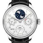 44.2 mm platinum case, 14.9 mm thick, see-through sapphire glass back, arched-edge sapphire glass crystal with antireflective coating on both sides, silver-plated dial, calibre 52615 automatic movement with date, day, month, perpetual calendar, year indicator, hours, minutes, small seconds, moonphase, power reserve indicator, approximately 168 hours of power reserve, black alligator leather strap by santoni. Water resistant to 3 bar.