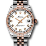 31mm stainless steel case, pink gold gold screw-down crown, 18K pink gold domed bezel set with 24 diamonds, scratch-resistant sapphire crystal with cyclops lens over the date, white dial, diamond hour markers, Rolex calibre 2235 automatic movement, stainless steel and pink gold Jubilee bracelet with five-piece links, concealed folding Crownclasp buckle. Waterproof to 100 meters.