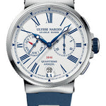 43 mm stainless steel case, 15 mm thick, white blue dial, Caliber UN-153 self-winding movement, rubber strap. Water resistant to 100 m.