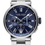 43 mm stainless steel case, screw-down security crown, blue dial, Caliber UN-153 self-winding movement with Ulysse Nardin performance certificate, 30-minutes, 12-hours and small seconds register, Annual calendar backward/forward setting with months counter at 9 o'clock, date, silicium technology, stainless steel bracelet. Water resistant to 100m.