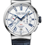 43mm stainless steel case, screw-down security crown crown, off white dial, Caliber UN-153 Self-winding movement with 30-minutes, 12-hours and small seconds registers, annual calendar backward/forward setting with months counter at 9 o'clock, date, leather strap, folding buckle. Water resistant to 100m.