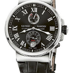 43mm titanium and stainless steel case, black dial with Roman numerals, caliber UN-118 self winding movement with hour and minute hands in the center, small seconds and round date window at 6 oÕclock, power reserve indicator at 12 oÕclock, approximately 60 hours of power reserve, black alligator strap. Water resistant to 100 meters.