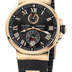 43mm 18K rose gold case, black dial with Roman numerals, caliber UN-118 self winding movement with hour and minute hands in the center, small seconds and round date window at 6 oÕclock, power reserve indicator at 12 oÕclock, approximately 60 hours of power reserve, black rubber strap. Water resistant to 100 meters.