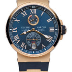 43mm 18K rose gold case, blue dial with Roman numerals, caliber UN-118 self winding movement with hour and minute hands in the center, small seconds and round date window at 6 oÕclock, power reserve indicator at 12 oÕclock, approximately 60 hours of power reserve, blue rubber strap. Water resistant to 100 meters.