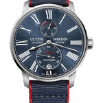 42 mm stainless steel case, blue dial, Caliber UN-118 self winding movement with date, approximately 60 hours of power reserve, fabric strap. Water resistant to 50 m.