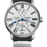 42 mm stainless steel case, screw-down security crown, sapphire crystal, white dial, Caliber UN-118 self-winding movement with COSC and Ulysse Nardin performance certificate, 60 hours power reserve indicator, oversized seconds-hand, date, silicium and diamonsil technology, rubber strap, folding buckle. Water resistant to 50m.