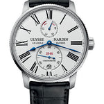 42 mm stainless steel case, screw-down security crown, sapphire crystal, white dial, Caliber UN-118 self-winding movement with COSC and Ulysse Nardin performance certificate, 60 hours power reserve indicator, oversized seconds-hand, date, silicium and diamonsil technology, leather strap, folding buckle. Water resistant to 50m.
