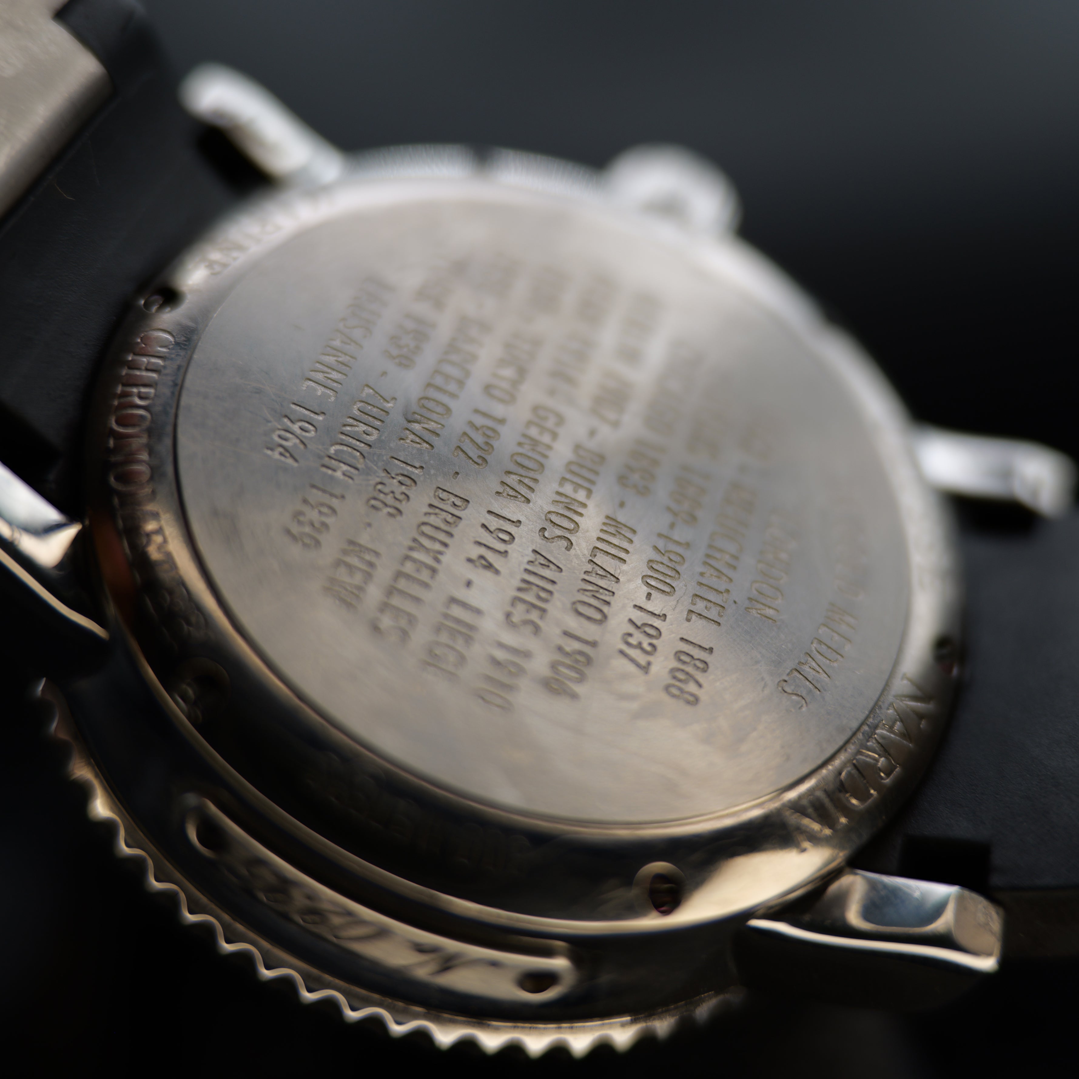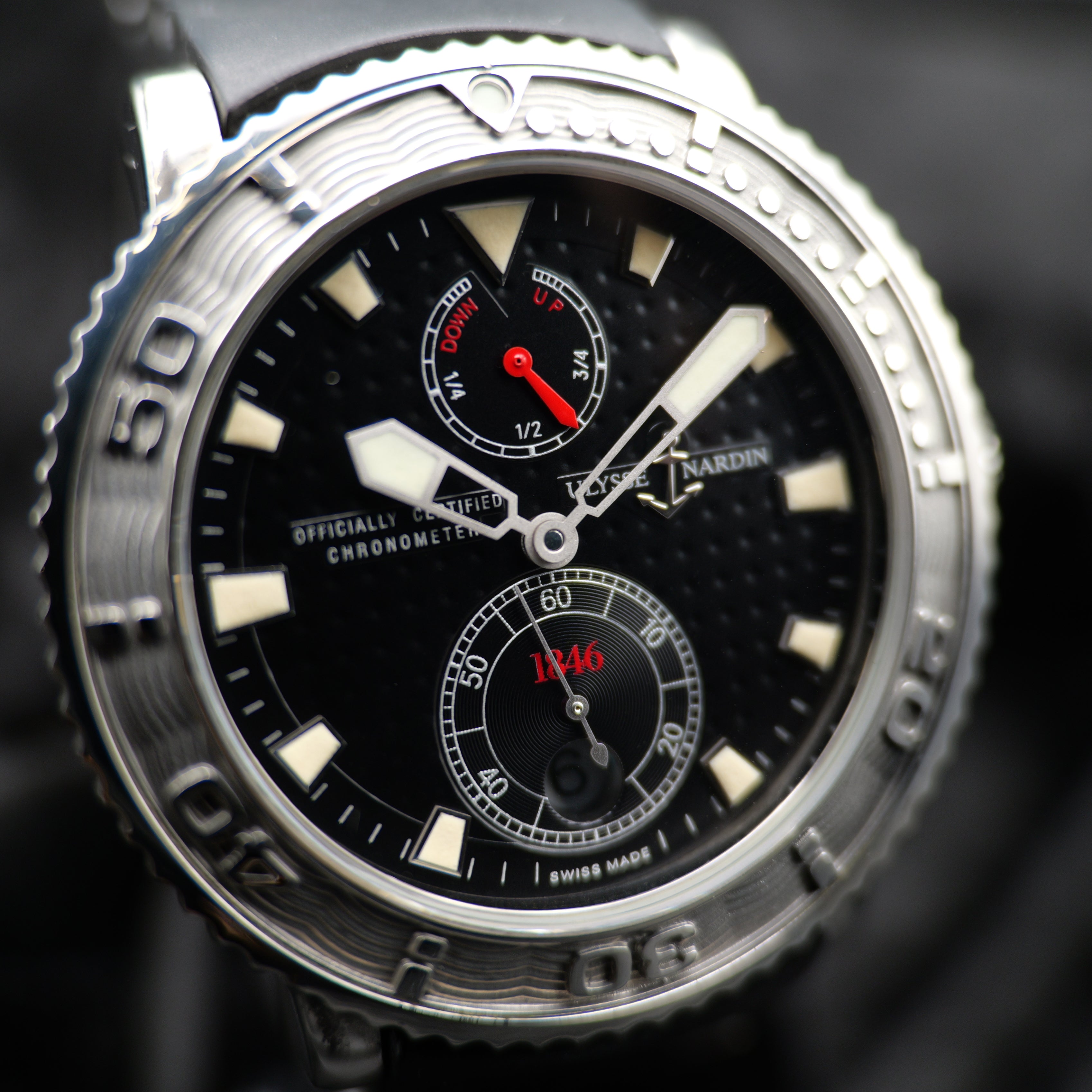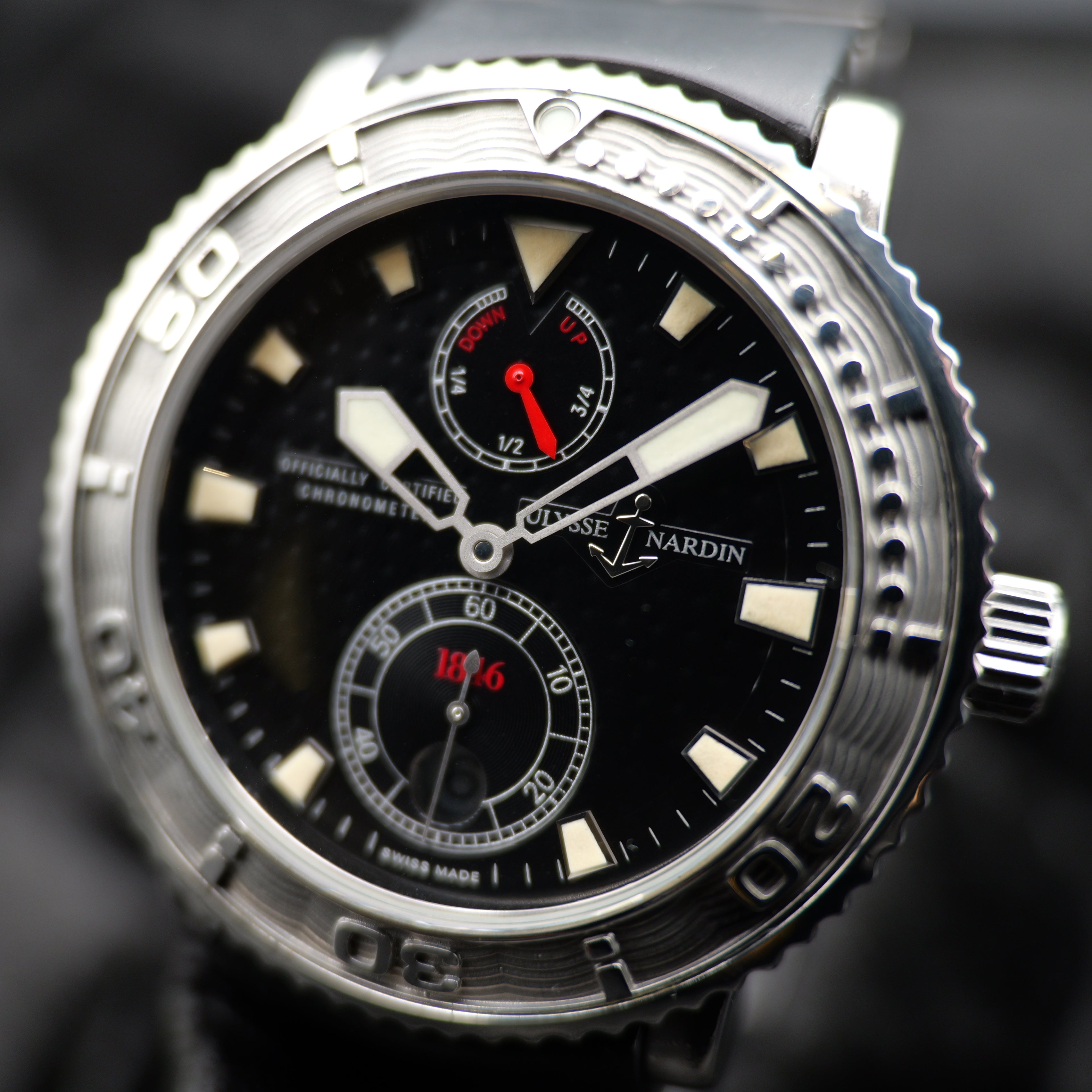 Up for sale is the Ulysse Nardin Maxi Marine Diver 263-55 40MM Stainless Steel Black Dial with UN Certificate, UN World Service Booklet, UN Marine Chronometer 1846 Booklet, UN Hang tag, Chronometer testing, and is double boxed. Watch is dated 2000. It was recently placed on a timegrapher and is running well. All of our watches are photographed under high intensity light with a macro lens. Any flaws will be significantly magnified. The serial numbers have been blurred for privacy. Timepiece is in excellent condition showing little to no signs of wear. Timepiece is located in Indiana.