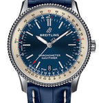 38.00 mm steel case, 10.10 mm thick, non screw-locked crown with two gaskets, bidirectional bezel with slide rule, cambered sapphire crystal with glareproof treatment on both sides, blue dial, Breitling 17 self-winding movement with date in dial aperture, approximately 38 hours of power reserve, blue croco strap, tang buckle. Water resistant to 3 bars.