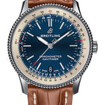 38.00 mm steel case, 10.10 mm thick, non screw-locked crown with two gaskets, bidirectional bezel with slide rule, cambered sapphire crystal with glareproof treatment on both sides, blue dial, Breitling 17 self-winding movement with date in dial aperture, approximately 38 hours of power reserve, gold croco strap, tang buckle. Water resistant to 3 bars.