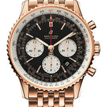 43.00 mm red gold case, 14.22 mm thick, sapphire crystal back, non screw-locked crown with two gaskets, bidirectional bezel with slide rule, cambered sapphire crystal with glareproof treatment on both sides, black dial, Breitling 01 self-winding movement with date in dial aperture and chronograph function, approximately 70 hours of power reserve, red gold Pilot bracelet. Water resistant to 3 bars.