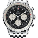 43.00 mm steel case, 14.22 mm thick, sapphire crystal back, non screw-locked crown with two gaskets, bidirectional bezel with slide rule, cambered sapphire crystal with glareproof treatment on both sides, black dial, Breitling 01 self-winding movement with date in dial aperture and chronograph function, approximately 70 hours of power reserve, steel Pilot bracelet. Water resistant to 3 bars.