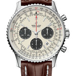 43.00 mm steel case, 14.22 mm thick, sapphire crystal back, non screw-locked crown with two gaskets, bidirectional bezel with slide rule, cambered sapphire crystal with glareproof treatment on both sides, mercury silver dial, Breitling 01 self-winding movement with date in dial aperture and chronograph function, approximately 70 hours of power reserve, brown croco strap, tang buckle. Water resistant to 3 bars.
