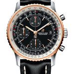41.00 mm steel and red gold case, 14.44 mm thick, non screw-locked crown with two gaskets, bidirectional bezel with slide rule, cambered sapphire crystal with glareproof treatment on both sides, black dial, Breitling 13 self-winding movement with date in dial aperture and chronograph function, approximately 48 hours of power reserve, black leather strap, tang buckle. Water resistant to 3 bars.