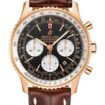 43.00 mm 18K red gold case, 14.22 mm thick, transparent sapphire crystal back, non screw-locked crown with two gaskets, bidirectional slide rule bezel, cambered sapphire crystal with glareproof treatment on both sides, black dial, Breitling 01 (Manufacture) self-winding movement, approximately 70 hrs of power reserve, brown croco strap, folding buckle. Water resistant to 3 bars.