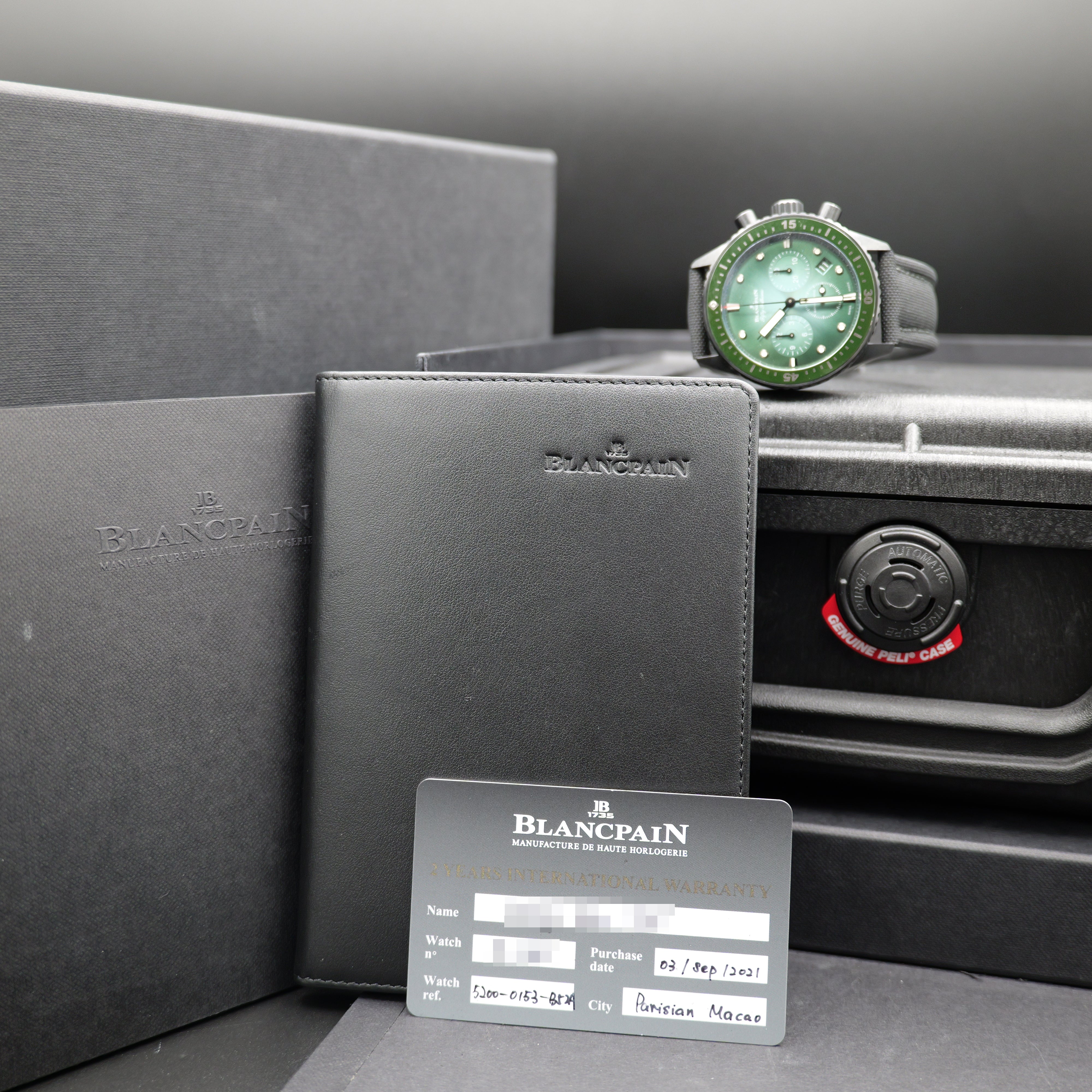Up for sale is the Fifty Fathoms Bathyscaphe Chronographe Flyback 5200-0153-B52A 43MM Ceramic Green Dial with Watch Case, Manufacturer Horlogerie, Service booklet, Warranty card, and is double boxed.. Watch is dated 2021. MSRP $22400. It was recently placed on a timegrapher and is running well. All of our watches are photographed under high intensity light with a macro lens. Any flaws will be significantly magnified. The serial numbers have been blurred for privacy. Timepiece is in like new condition and is located in Indiana.