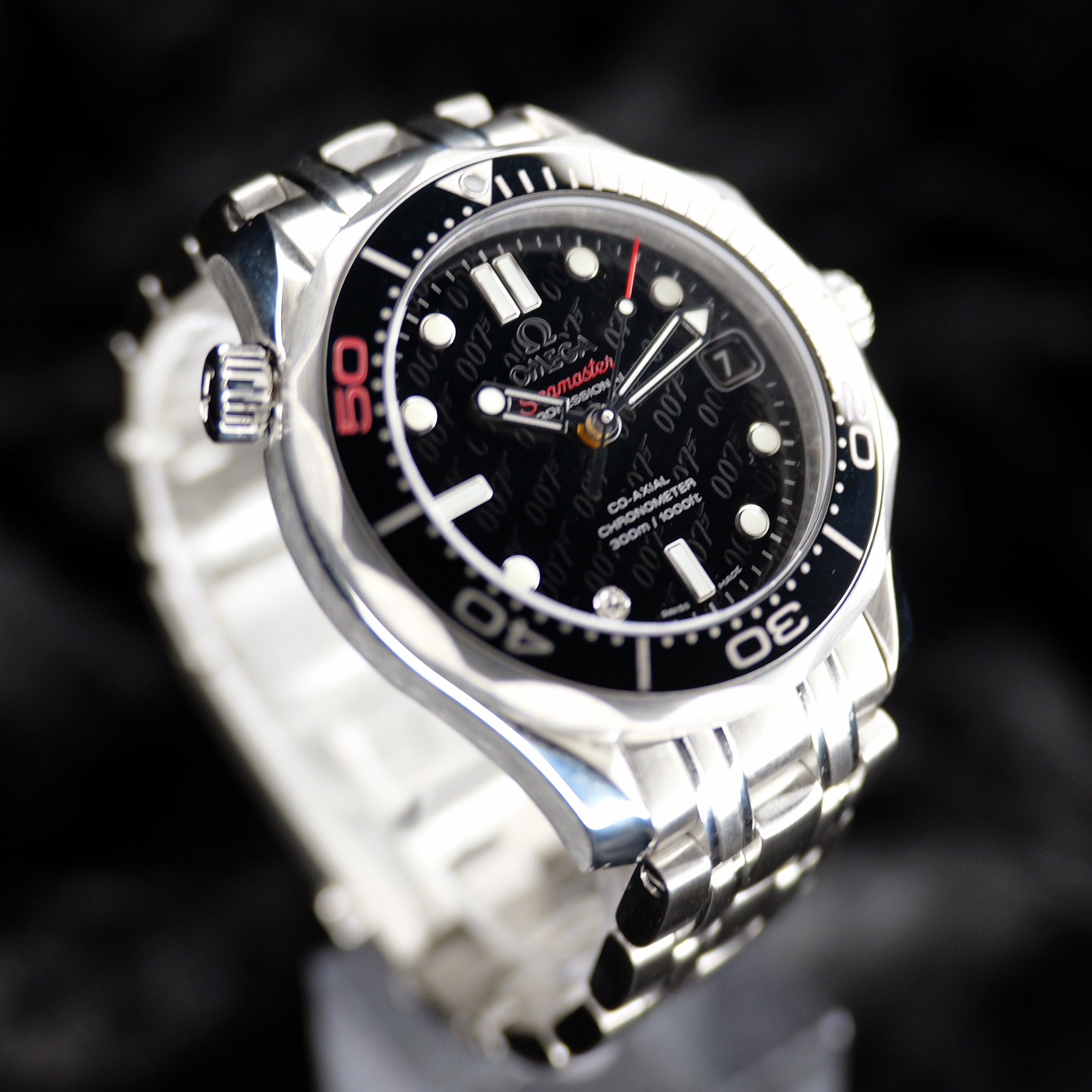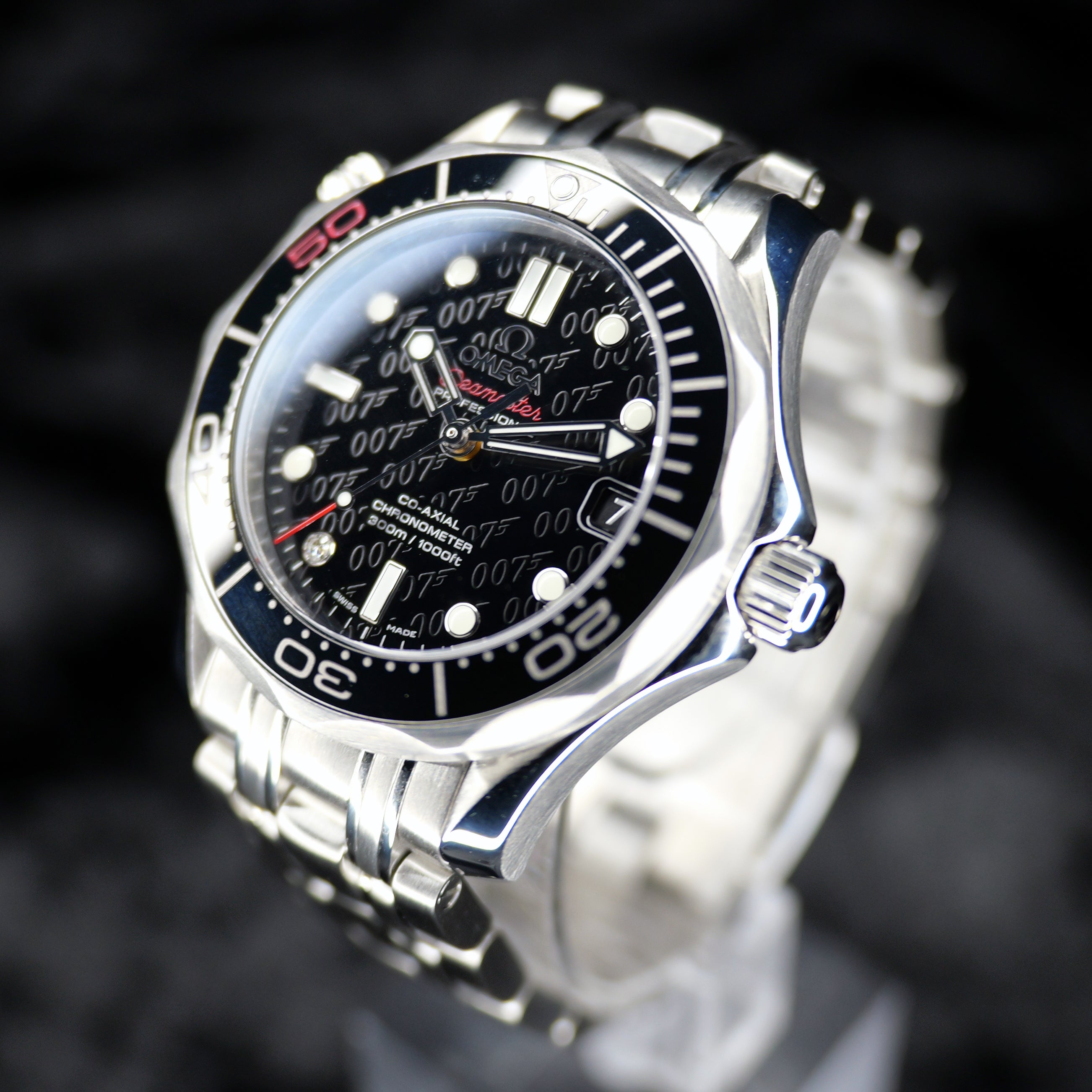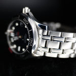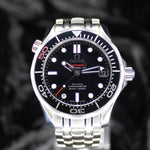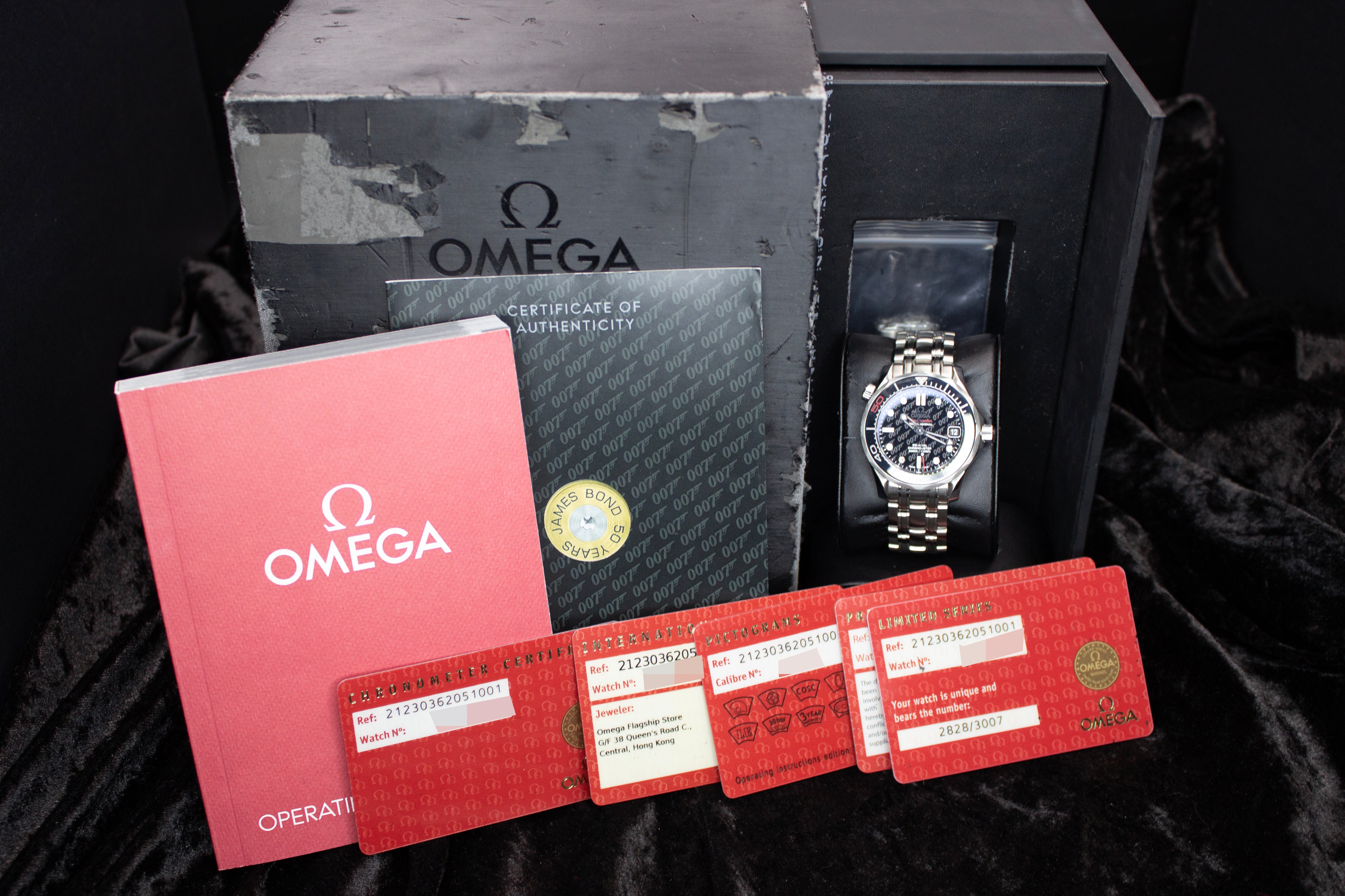 Up for sale is the Omega Seamaster Diver 300 M James Bond 50th Anniversary 212.30.36.20.51.001 36MM Steel Black Dial with Instructions booklet, certificate of authenticity pamphlet, warranty card, limited series card, precious stones certificate card, chronometer certificate card, pictograms card, and is boxed. Watch is fitted to 15cm and comes with 2 extra links. Watch is dated 2012. It was recently placed on a timegrapher and is running well. All of our watches are photographed under high intensity light with a macro lens. Any flaws will be significantly magnified. The serial numbers have been blurred for privacy. Timepiece is in excellent condition showing little to no signs of wear. Box shows signifigant wear but functions as expected Timepiece is located in Indiana.