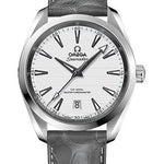 38 mm stainless steel case, transparent back, screw-in crown, domed scratch-resistant sapphire crystal with anti-reflective treatment on both sides, silvery dial with a horizontal teak pattern, caliber 8800 self-winding Co-Axial master chronometer movement with date function, approximately 55 hours of power reserve, grey leather strap. Water resistant to 150 m (500 ft).