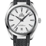 38 mm stainless steel case, transparent back, screw-in crown, domed scratch-resistant sapphire crystal with anti-reflective treatment on both sides, silvery dial with a horizontal teak pattern, caliber 8800 self-winding Co-Axial master chronometer movement with date function, approximately 55 hours of power reserve, grey structured rubber strap with grey lining. Water resistant to 150 m (500 ft).