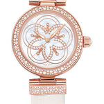 34 mm sedna gold case set with stunning diamonds, transparent back, self-locking crown, 18K sedna gold bezel paved with snow-set diamonds, sapphire crystal with anti-reflective treatment on both sides, white dial, caliber 8421 self-winding movement, approximately 50 hours of power reserve, white leather strap. Water resistant to 100 m (330 ft).