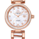 34 mm 18K Sedna red gold case, transparent back, screw-in crown, bezel set with 60 baguette-cut diamonds, domed scratch-resistant sapphire crystal with anti-reflective treatment on both sides, pearled mother-of-pearl dial with diamond hour markers, self-winding chronometer Omega 8521 movement with Co-Axial Escapement and date, approximately 50 hours of power reserve, Sedna gold bracelet with central links inlaid with extra white mother-of-pearl. Water resistant to 100 m.