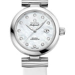 34 mm steel case, transparent back, self-locking crown, steel bezel, sapphire crystal with anti-reflective treatment on both sides, white dial set with 11 diamonds indexes, caliber 8520 self-winding movement with date window at 3 o'clock, approximately 50 hours of power reserve, white leather strap. Water resistant to 100 m (330 ft).