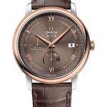 39.5 mm stainless steel and 18K red gold case, scratch-resistant sapphire crystal anti-reflective treatment inside, sun-brushed chestnut dial with polished Roman numeral hour markers and cabochons, Caliber Omega 2627 self winding movement with rhodium-plated finish, chronometer, date, power reserve indicator, approximately 48 hours of power reserve, brown leather strap. Water resistant to 3 bar (30 metres / 100 feet).