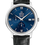 39.5 mm stainless steel case, domed scratch-resistant sapphire crystal with anti-reflective treatment inside, blue dial with Roman numerals and index hour markers, self-winding chronometer Omega 2627 movement with Co-Axial Escapement, date, power reserver, and small seconds, approximately 48 hours of power reserve, black leather strap. Water resistant to 100 m.