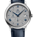 39.5 mm stainless steel case, scratch-resistant sapphire crystal anti-reflective treatment inside, grey dial with a silk-like pattern and an opaline finish, Caliber Omega 2627 self winding movement with rhodium-plated finish, chronometer, date, power reserve indicator, approximately 48 hours of power reserve, blue leather strap. Water resistant to 3 bar (30 metres / 100 feet).