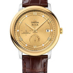 39.5 mm steel case, 18K yellow gold bezel, sapphire crystal with anti-reflective treatment inside, champagne dial with roman numeral hour markers and diamond indexes, caliber 2627 self-winding movement with chronometer, co-axial escapement with rhodium-plated finish, approximately 48 hours of power reserve, brown leather strap. Water resistant to 30 m (100 ft).