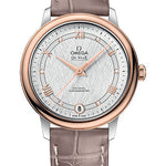 32.7 mm stainless steel and 18K red gold case, scratch-resistant sapphire crystal anti-reflective treatment inside, white silvery dial with a silk-like pattern and an opaline finish, Caliber Omega 2500 self winding movement with rhodium-plated finish, chronometer, date, approximately 48 hours of power reserve, taupe-brown leather strap. Water resistant to 3 bar (30 metres / 100 feet).