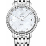 32.7 mm stainless steel case, diamond bezel, domed scratch-resistant sapphire crystal with anti-reflective treatment inside, white mother-of-pearl dial with Roman numerals and 8 diamond hour markers, self-winding chronometer Omega 2500 movement with Co-Axial Escapement, approximately 48 hours of power reserve, stainless steel bracelet. Water resistant to 100 m.