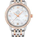 32.7 mm stainless steel case, sapphire back, diamond-set 18K red gold bezel, domed scratch-resistant sapphire crystal with anti-reflective treatment inside, white mother-of-pearl dial with a unique polished butterfly pattern enhanced by a transferred outline against a matt background, caliber 2500 self-winding movement with chronometer and a date window at 6 o'clock, approximately 48 hours of power reserve, red gold-steel bracelet with two tone. Water resistant to 3 bar.