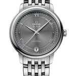 32.7 mm stainless steel case, scratch-resistant sapphire crystal anti-reflective treatment inside, grey dial with polished Roman numeral hour markers and cabochons, Caliber Omega 2500 self winding movement with rhodium-plated finish, chronometer, date, approximately 48 hours of power reserve, stainless steel bracelet. Water resistant to 3 bar (30 metres / 100 feet).