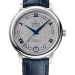 32.7 mm stainless steel case, scratch-resistant sapphire crystal anti-reflective treatment inside, grey dial with a silk-like pattern and an opaline finish, Caliber Omega 2500 self winding movement with rhodium-plated finish, chronometer, date, approximately 48 hours of power reserve, blue leather strap. Water resistant to 3 bar (30 metres / 100 feet).