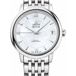 32.7 mm stainless steel case, domed scratch-resistant sapphire crystal with anti-reflective treatment inside, white mother-of-pearl dial with Roman numerals and index hour markers, self-winding chronometer Omega 2500 movement with Co-Axial Escapement, approximately 48 hours of power reserve, stainless steel bracelet. Water resistant to 100 m.