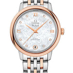 32.7 mm stainless steel case, sapphire back, 18K red gold bezel, domed scratch-resistant sapphire crystal with anti-reflective treatment inside, white mother-of-pearl dial with a unique polished butterfly pattern enhanced by a transferred outline against a matt background, caliber 2500 self-winding movement with chronometer and a date window at 6 o'clock, approximately 48 hours of power reserve, red gold-steel bracelet with two tone. Water resistant to 3 bar.