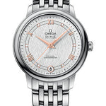 32.7 mm stainless steel case, scratch-resistant sapphire crystal anti-reflective treatment inside, white silvery dial with a silk-like pattern and an opaline finish, Caliber Omega 2500 self winding movement with rhodium-plated finish, chronometer, date, approximately 48 hours of power reserve, stainless steel bracelet. Water resistant to 3 bar (30 metres / 100 feet).