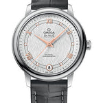 32.7 mm stainless steel case, scratch-resistant sapphire crystal anti-reflective treatment inside, white silvery dial with a silk-like pattern and an opaline finish, Caliber Omega 2500 self winding movement with rhodium-plated finish, chronometer, date, approximately 48 hours of power reserve, grey leather strap. Water resistant to 3 bar (30 metres / 100 feet).