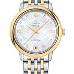 32.7 mm stainless steel case, sapphire back, 18K yellow gold bezel, domed scratch-resistant sapphire crystal with anti-reflective treatment inside, white mother-of-pearl dial with a unique polished butterfly pattern enhanced by a transferred outline against a matt background, caliber 2500 self-winding movement with chronometer and a date window at 6 o'clock, approximately 48 hours of power reserve, yellow gold-steel bracelet with two tone. Water resistant to 3 bar.