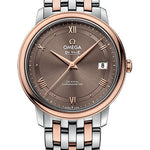 36.8 mm stainless steel and 18K red gold case, scratch-resistant sapphire crystal anti-reflective treatment inside, lacquered sun-brushed chestnut dial with polished Roman numeral hour markers and cabochons, Caliber Omega 2500 self winding movement with rhodium-plated finish, chronometer, date, approximately 48 hours of power reserve, stainless steel and red gold bracelet. Water resistant to 3 bar (30 metres / 100 feet).