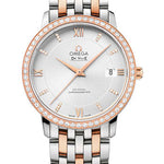 36.8 mm stainless steel and red gold case, sapphire back, diamond-set 18K red gold bezel, domed scratch-resistant sapphire crystal with multi-layered anti-reflective treatment inside, silver dial with diamond-set indexes and roman numerals at the 3-6-9 and 12 o'clock positions and date window at 3 o’clock, calibre 2500 self-winding movement with co-axial escapement movement with rhodium-plated finish, approximately 48 hours of power reserve, two-tone steel and red gold bracelet. Water resistant to 3 bar.