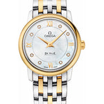 27.4 mm stainless steel and yellow gold case, scratch-resistant sapphire crystal, white mother-of-pearl dial with 8 diamond hour markers, quartz Omega 1376 movement, approximately 41 months of power reserve, stainless steel and yellow gold bracelet. Water resistant to 30 m.