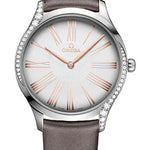39 mm stainless steel case, scratch-resistant sapphire crystal anti-reflective treatment inside, lacquered opaline silver dial includes embossed 18K Sedna™ gold Roman numerals, which is the same material used for the hands, Omega 4061 quartz movement with long life feature to maximize the autonomy of the battery, grey fabric strap. Water resistant to 3 bar (30 metres / 100 feet).