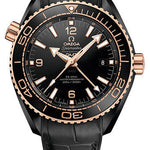 45.5 mm black ceramic case with anti-magnetic properties and helium escape valve, transparent back, 18K Sedna gold screw-in crown, 18K Sedna gold unidirectional rotating bezel with black ceramic inserrt featuring a Ceragold diving scale, domed scratch-resistant sapphire crystal with anti-reflective treatment on both sides, black dial with 18K Sedna gold Arabic numerals and hands, caliber 8906 Self-winding chronometer movement with Co-Axial escapement and GMT time zone function, black water resistant leather strap with rubber lining. Water resistant to 600 m (2000 ft).