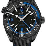 45.5 mm black ceramic case with anti-magnetic properties and helium escape valve, transparent back, screw-in crown, unidirectional rotating bezel with blue covering the first 15 minutes of the diving scale and Liquidmetal on the remainder, domed scratch-resistant sapphire crystal with anti-reflective treatment on both sides, black dial with blue Arabic numerals and 18K white gold hands coated in white Super-LumiNova, caliber 8906 Self-winding chronometer movement with Co-Axial escapement and GMT time zone function, approximately 60 hours of power reserve, black rubber strap with blue stitching. Water resistant to 600 m (2000 ft).