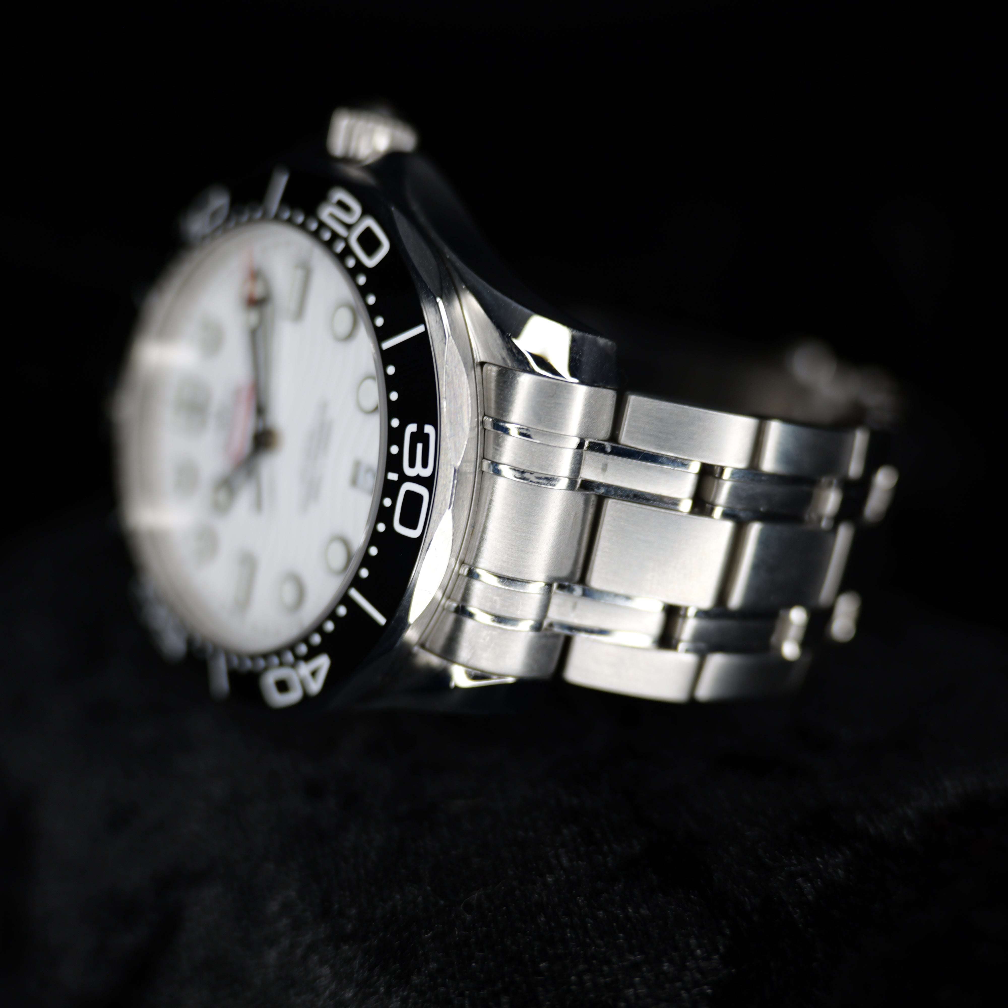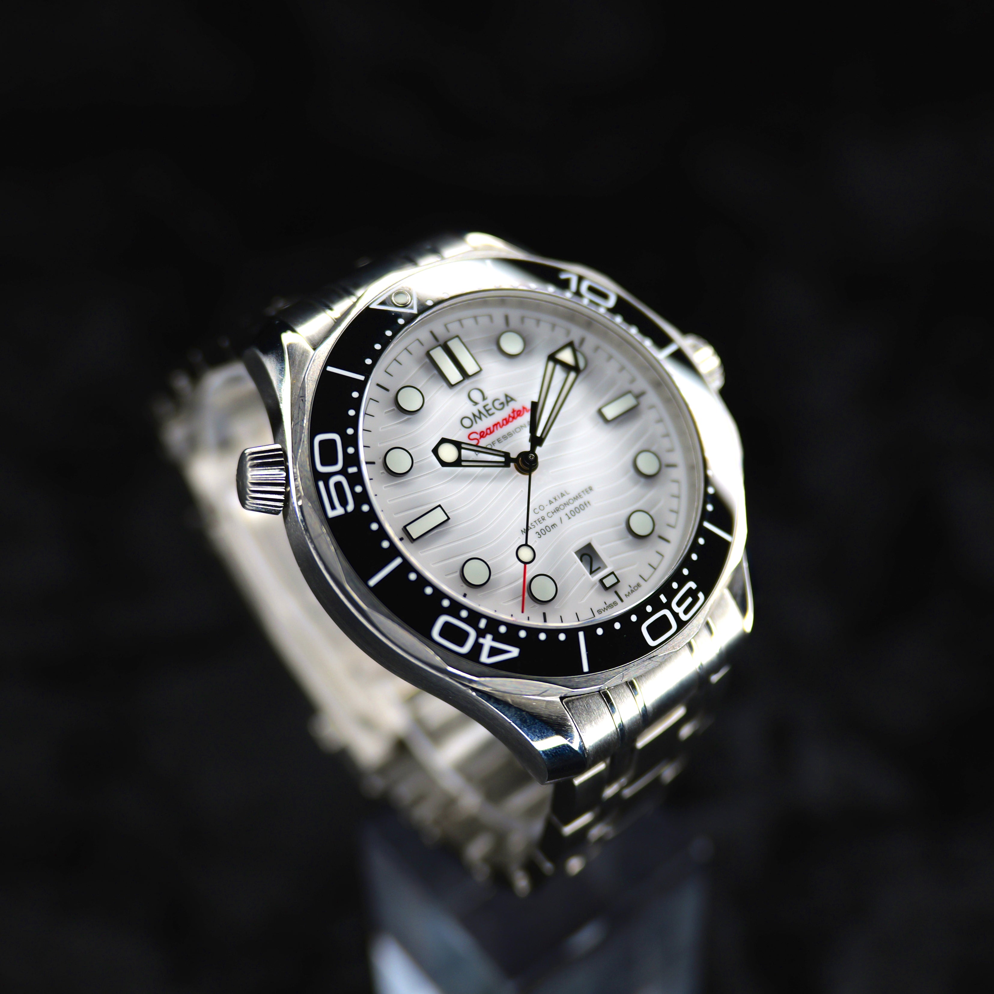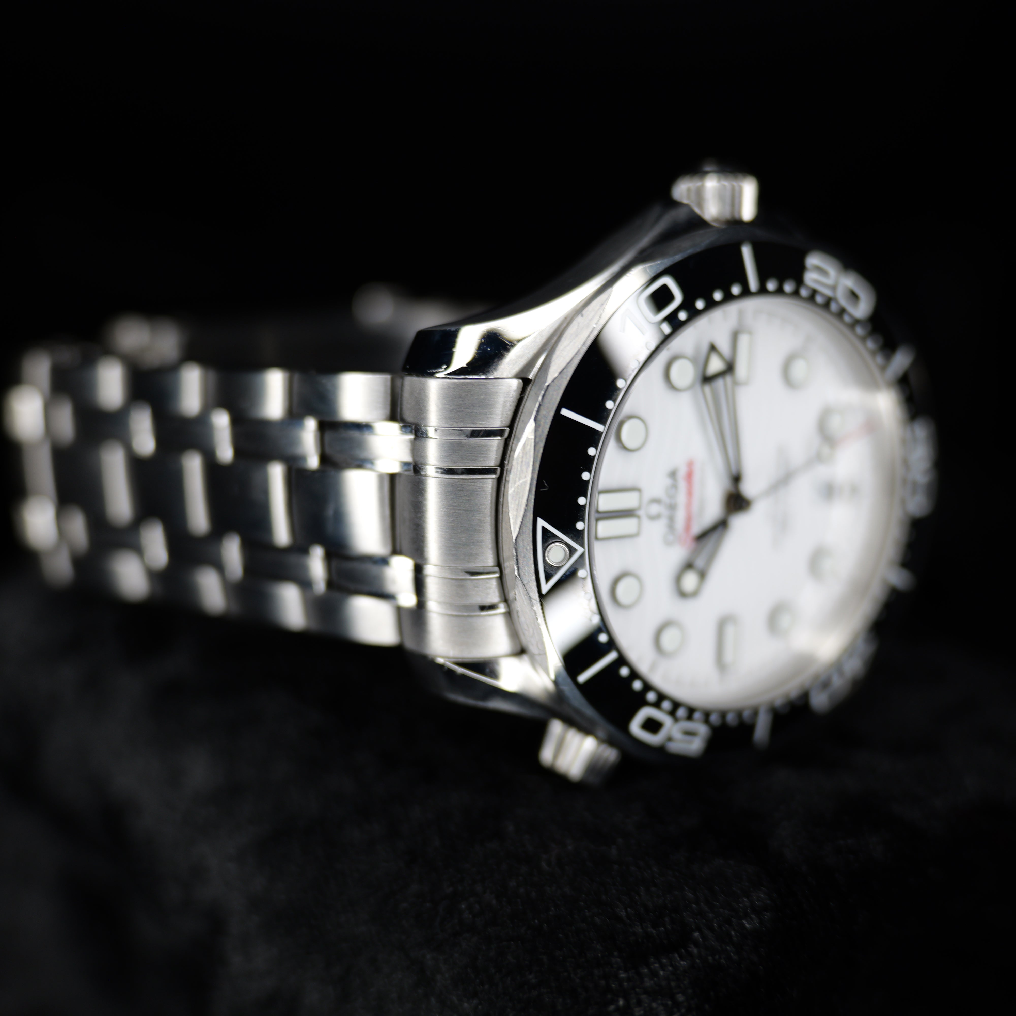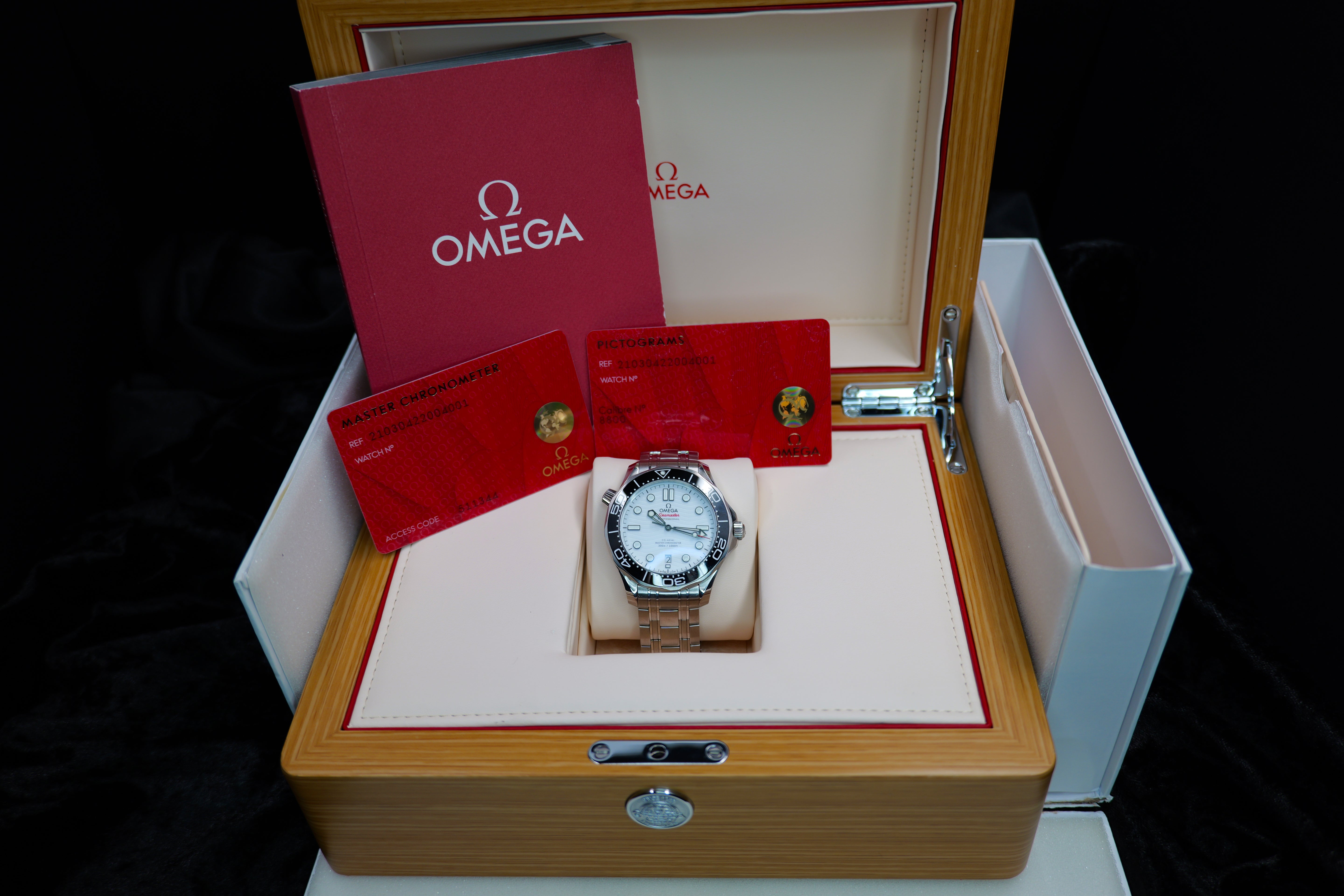 Up for sale is the Omega Seamaster Diver 300 M 210.30.42.20.04.001 42MM Steel White Dial with Instructions booklet, extra links, pictograms card, master chronometer card, and is double boxed. Watch is fitted to 18.5cm and comes with 3 extra links. MSRP $6,700. It was recently placed on a timegrapher and is running well. All of our watches are photographed under high intensity light with a macro lens. Any flaws will be significantly magnified. The serial numbers have been blurred for privacy. Timepiece is in excellent condition showing little to no signs of wear. Timepiece is located in Indiana.