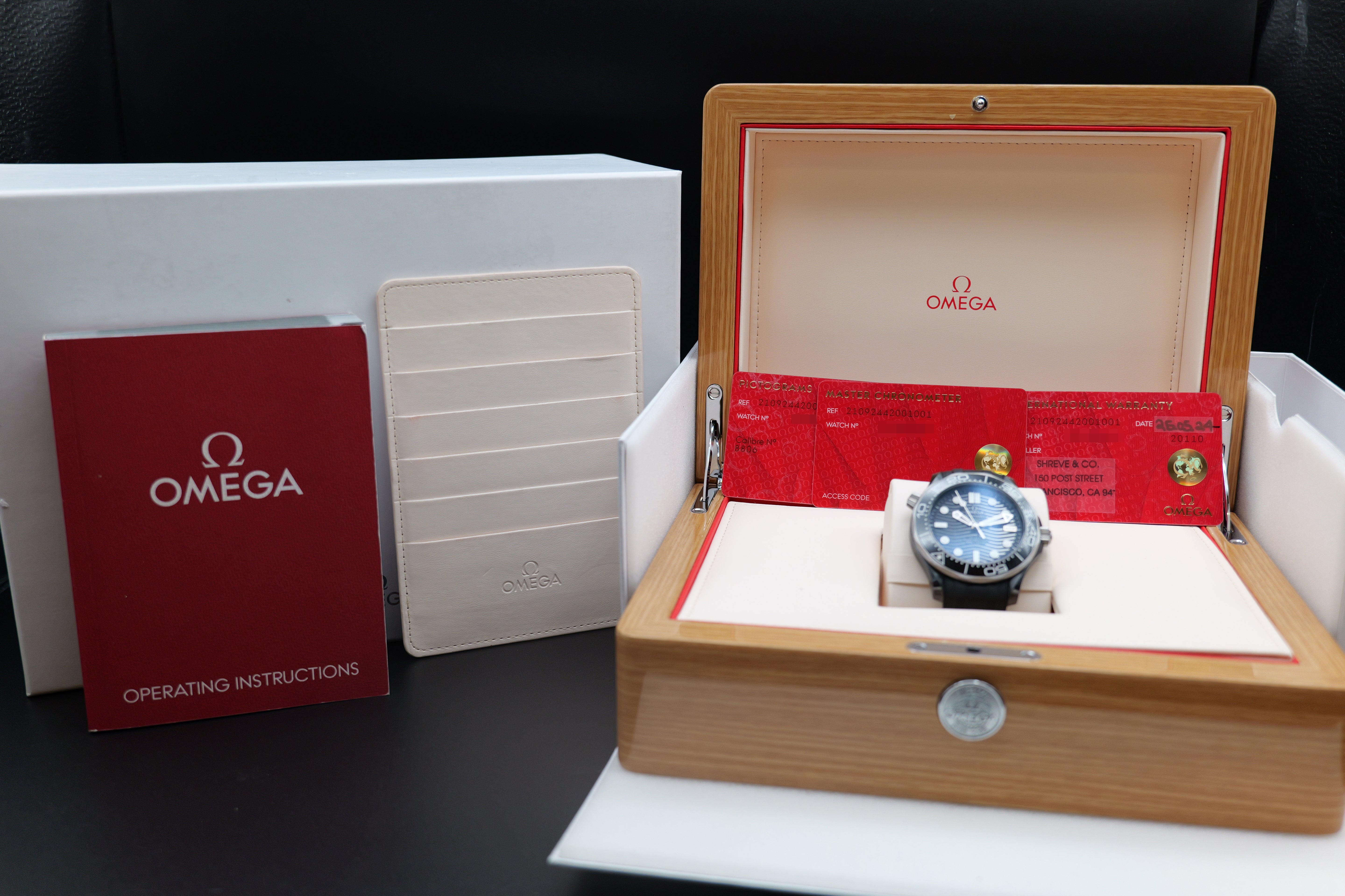 Up for sale is the Omega Seamaster Diver 300M 210.92.44.20.01.001 43.5MM Black Ceramic Dial with Omega operating instructions, card holder, Master Chronometer card, Pictograms card, International warranty card, and is double boxed. Watch is dated 2024. MSRP $9,500. It was recently placed on a timegrapher and is running well. All of our watches are photographed under high intensity light with a macro lens. Any flaws will be significantly magnified. The serial numbers have been blurred for privacy. Timepiece is in mint condition; inner box is in mint condition. Timepiece is located in Indiana.