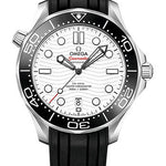 42 mm steel case with anti-magnetic protection and helium escape valve, transparent back, black ceramic bezel, domed scratch-resistant sapphire crystal with anti-reflective treatment on both sides, white dial with laser-engraved waves and Seamaster highlighted in red, Calibre Omega 8800 self-winding co-axial master chronometer movement with date, approximately 55 hours of power reserve, integrated black rubber strap. Water resistant to 300 metres (1000 feet).