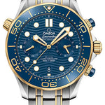 44 mm steel and yellow gold case with anti-magnetic protection and helium escape valve, transparent back, polished blue ceramic bezel, domed scratch-resistant sapphire crystal with anti-reflective treatment on both sides, blue dial with laser-engraved waves and a date window at 6 oclock, Calibre Omega 9900 self-winding co-axial master chronometer movement with chronograph, small seconds, and date, approximately 60 hours of power reserve, steel and yellow gold bracelet. Water resistant to 300 metres (1000 feet).